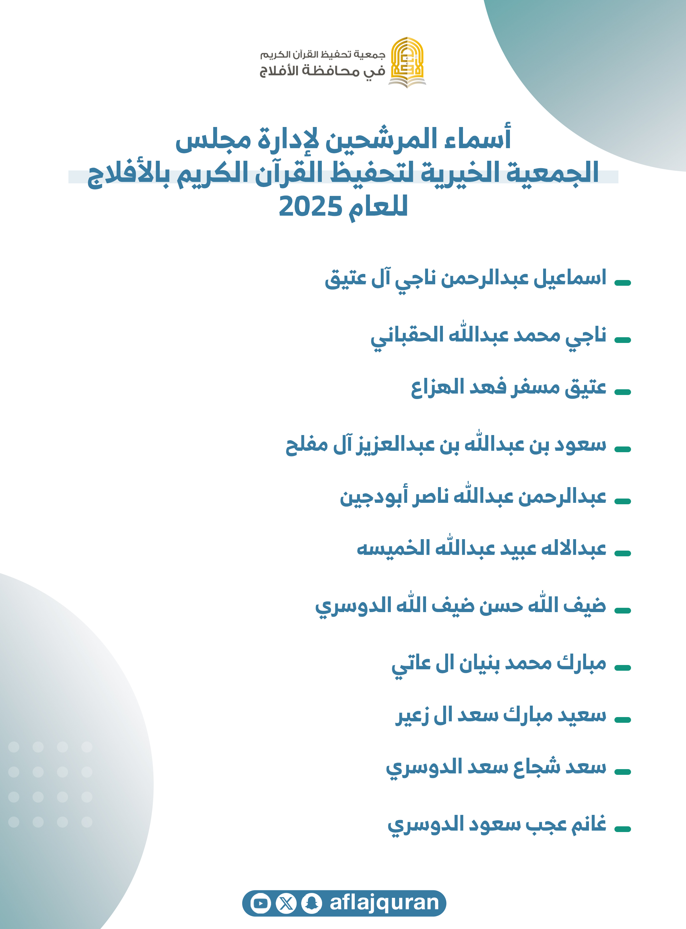 أسماء المرشحين لإدارة مجلس الجمعية الخيرية لتحفيظ القرآن الكريم بالأفلاج للعام 2025 اسماعيل عبدالرحمن ناجي آل عتيق ..